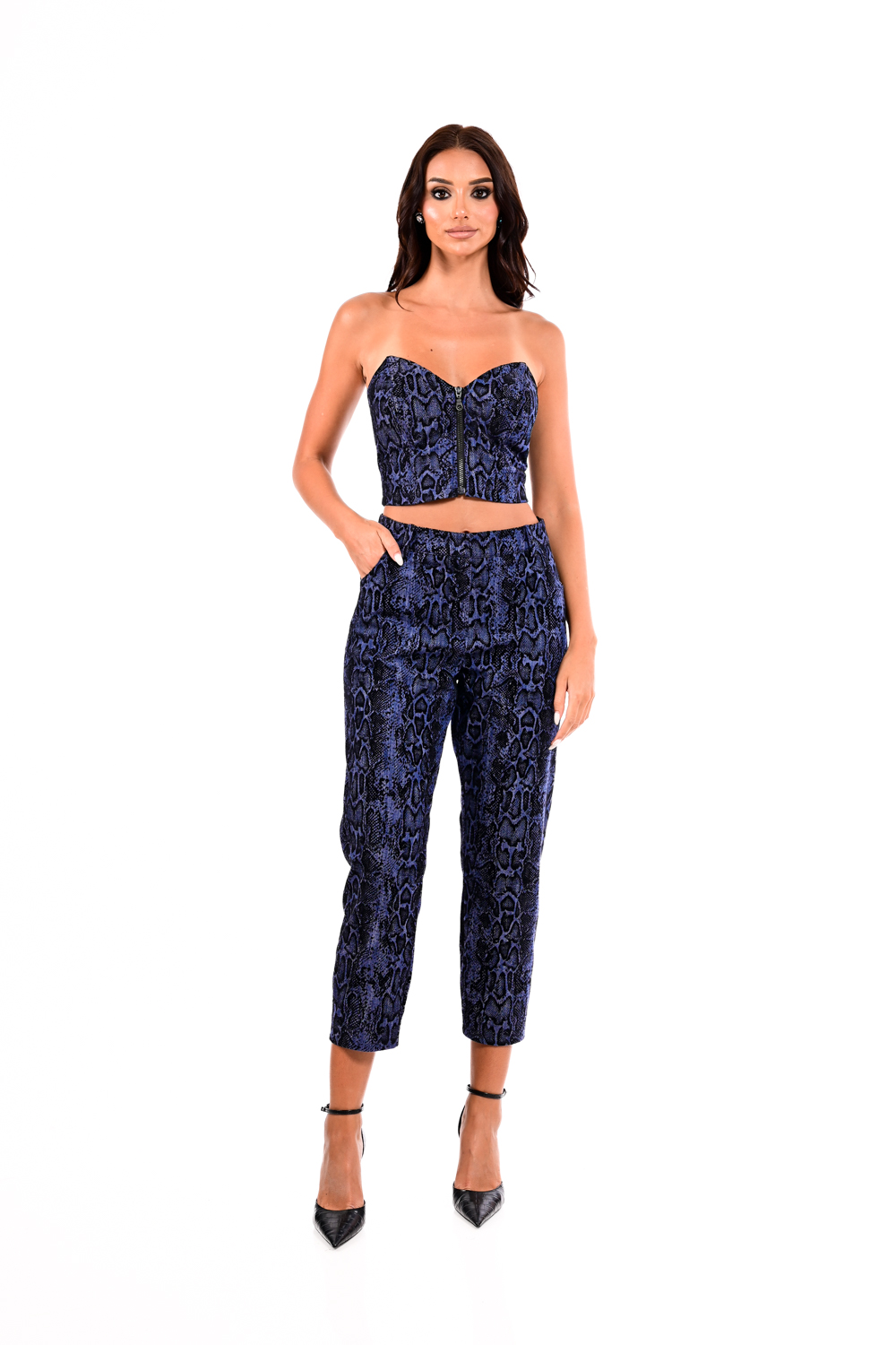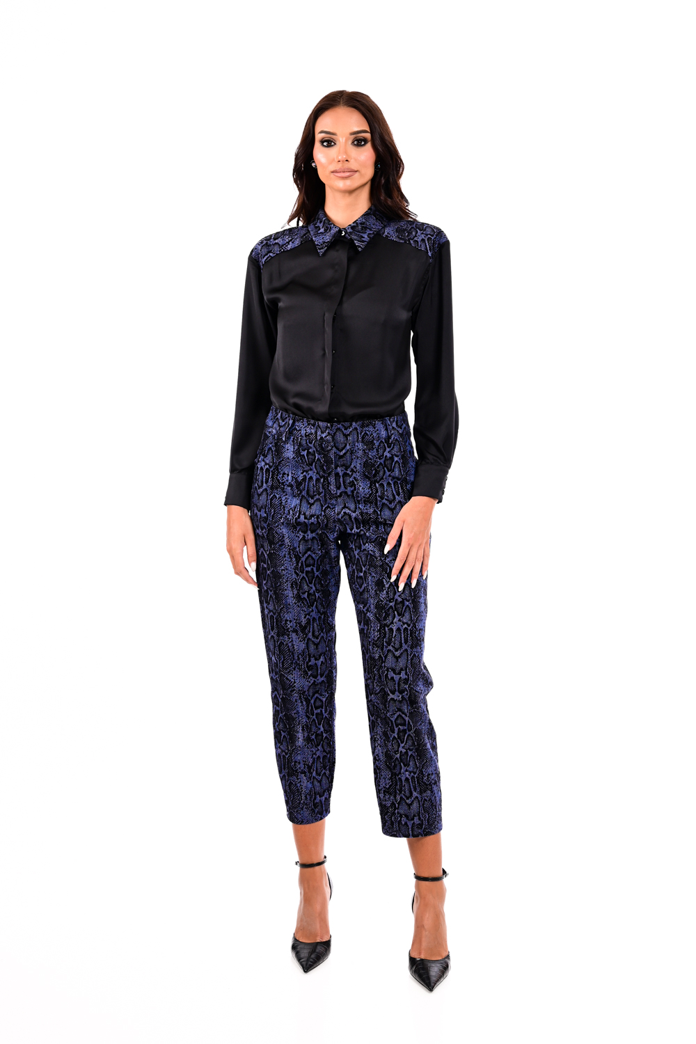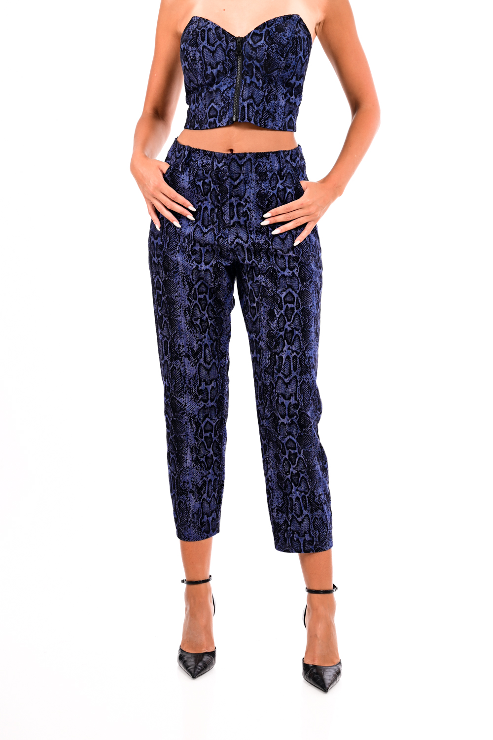 Αναδείξτε τη δυναμική πλευρά του στυλ σας με αυτό το εντυπωσιακό τζιν παντελόνι σε μπλε αποχρώσεις, διακοσμημένο με φλοκό snake print.