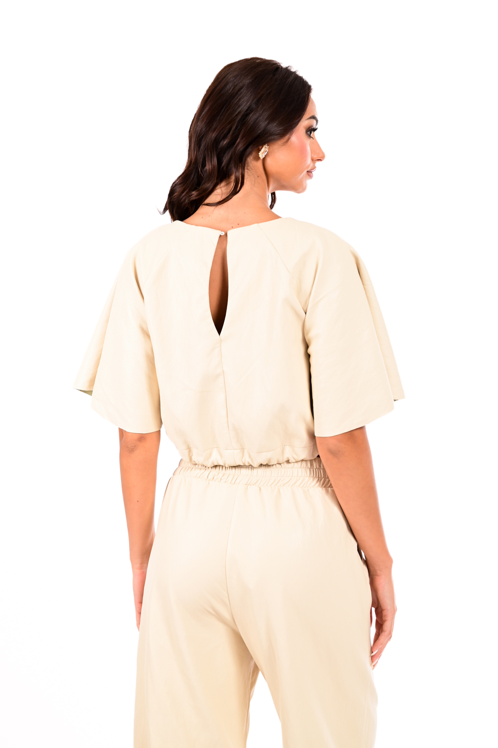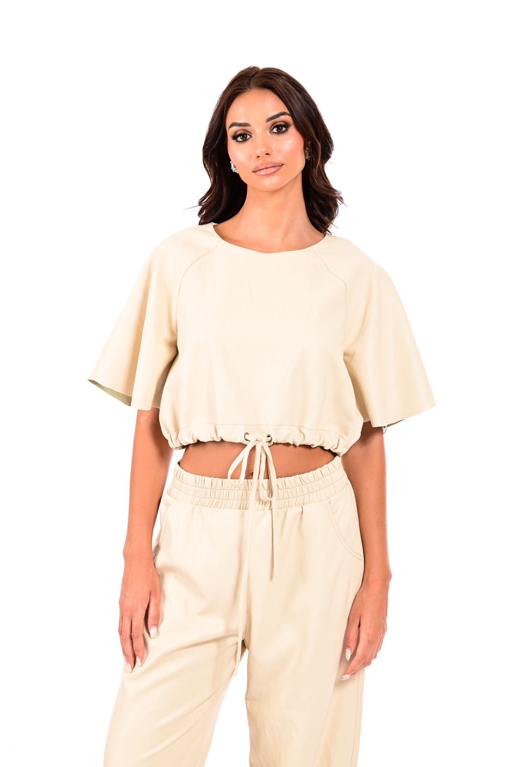 Αναβαθμίστε τα καθημερινά σας looks με αυτή τη crop μπλούζα από δερματίνη, με φαρδιά μανίκια και κορδόνι στη μέση για ρυθμιζόμενη εφαρμογή.