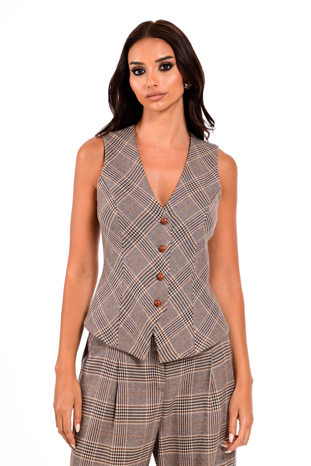 Ανακάλυψε το απόλυτα διαχρονικό γιλέκο με καρό print και κουμπιά μπροστά που χαρίζει κομψότητα σε κάθε εμφάνιση. Η εφαρμογή του ακολουθεί τη σιλουέτα και τονίζει τη μέση, ενώ το κλασικό καρό μοτίβο προσθέτει αυθεντικό preppy χαρακτήρα. Ιδανικό για να φορεθεί μόνο του για πιο statement look ή πάνω από πουκάμισο και T-shirt για layered εμφανίσεις, αποτελεί ένα must-have κομμάτι που συνδυάζει άνεση και στυλ.