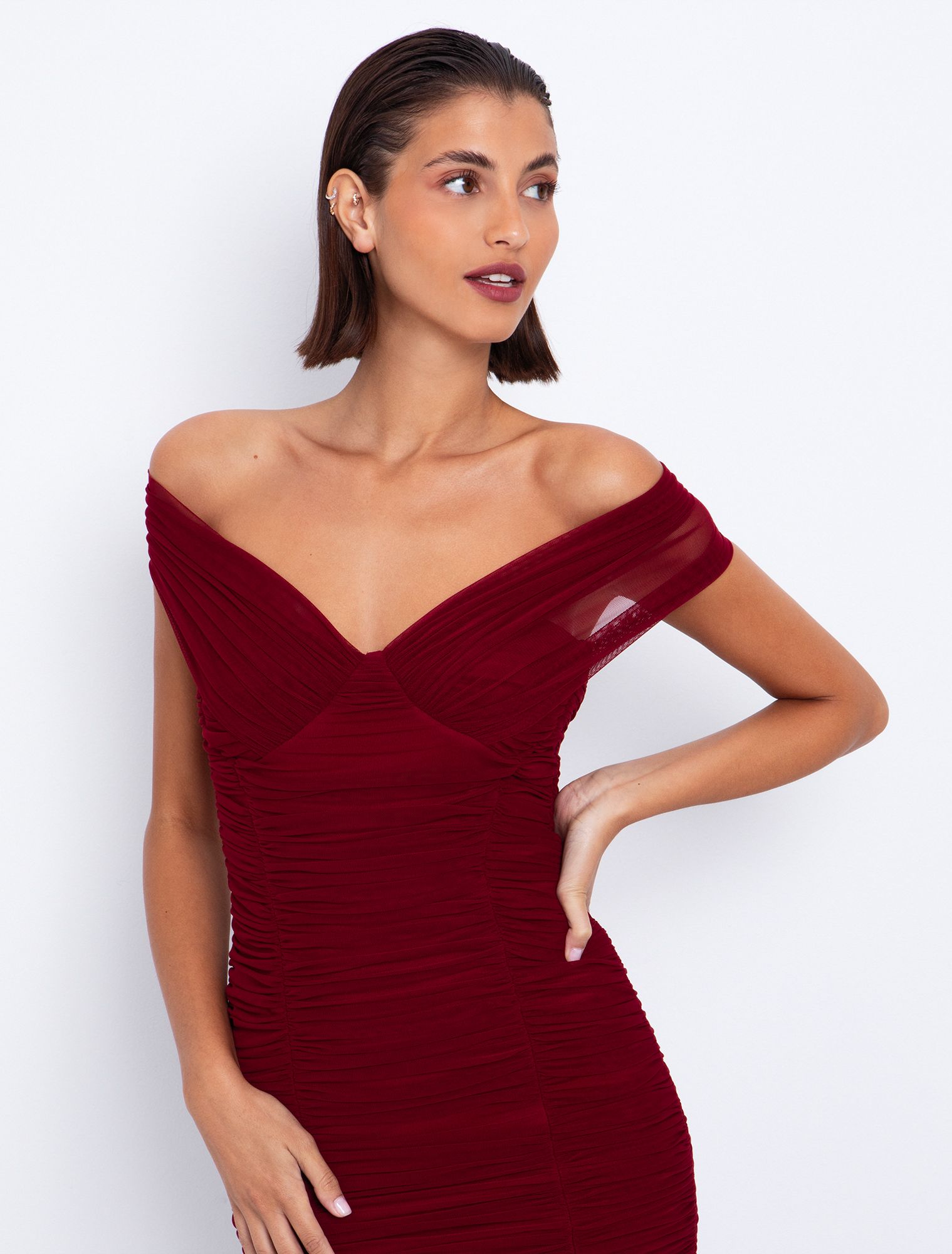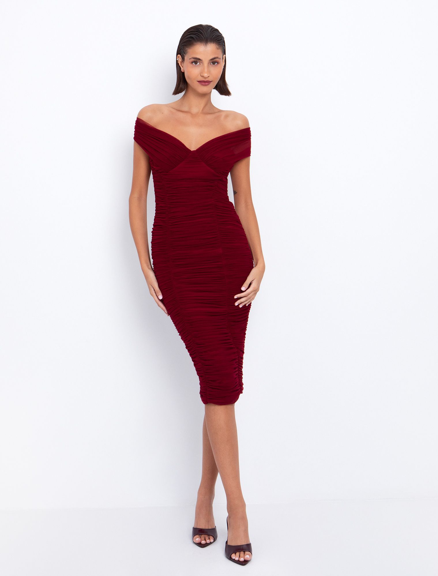 - Εφαρμοστό midi φόρεμα με ακάλυπτους ώμους